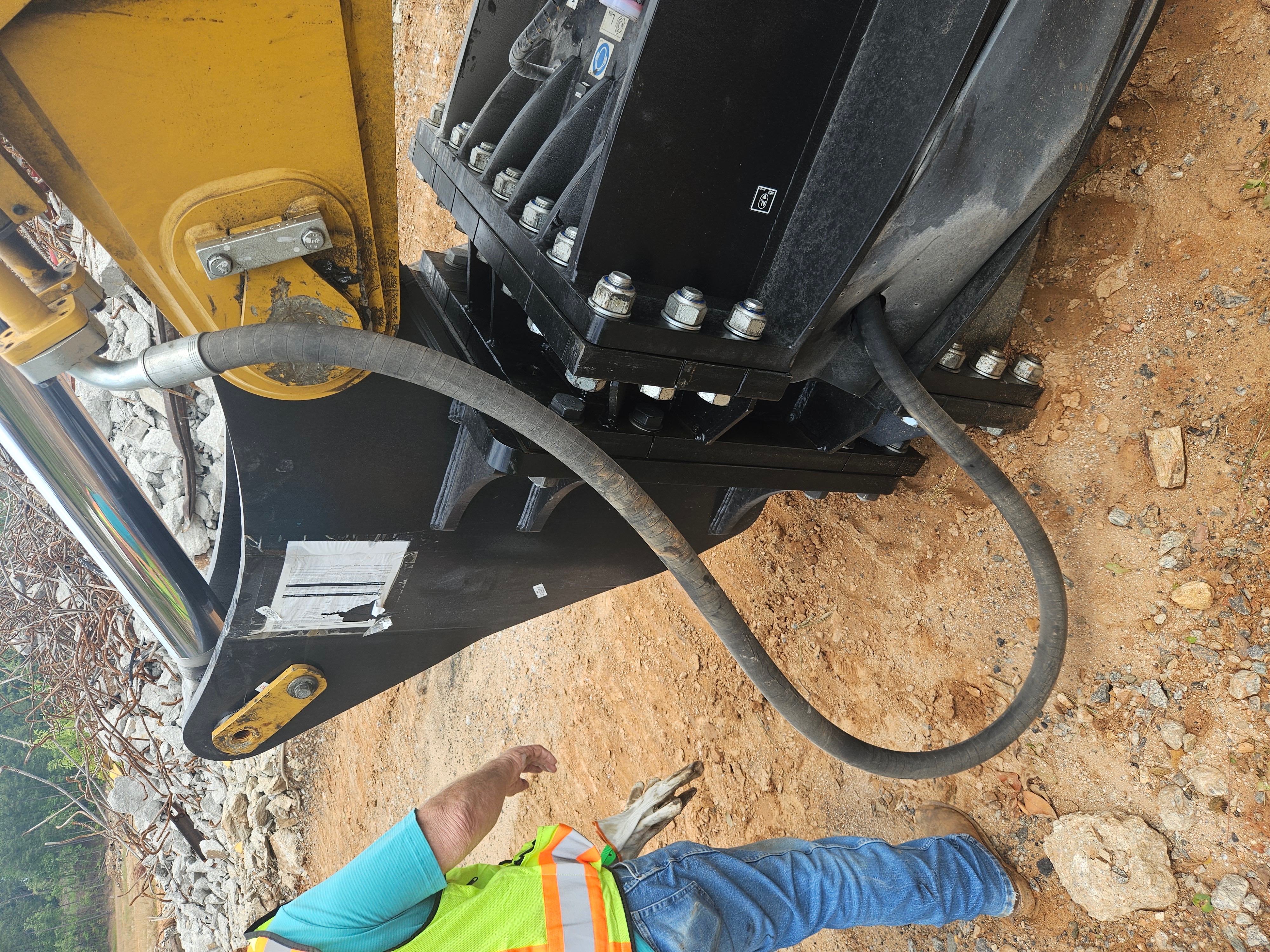 Worker performing heavy equipment repair on an excavator attachment