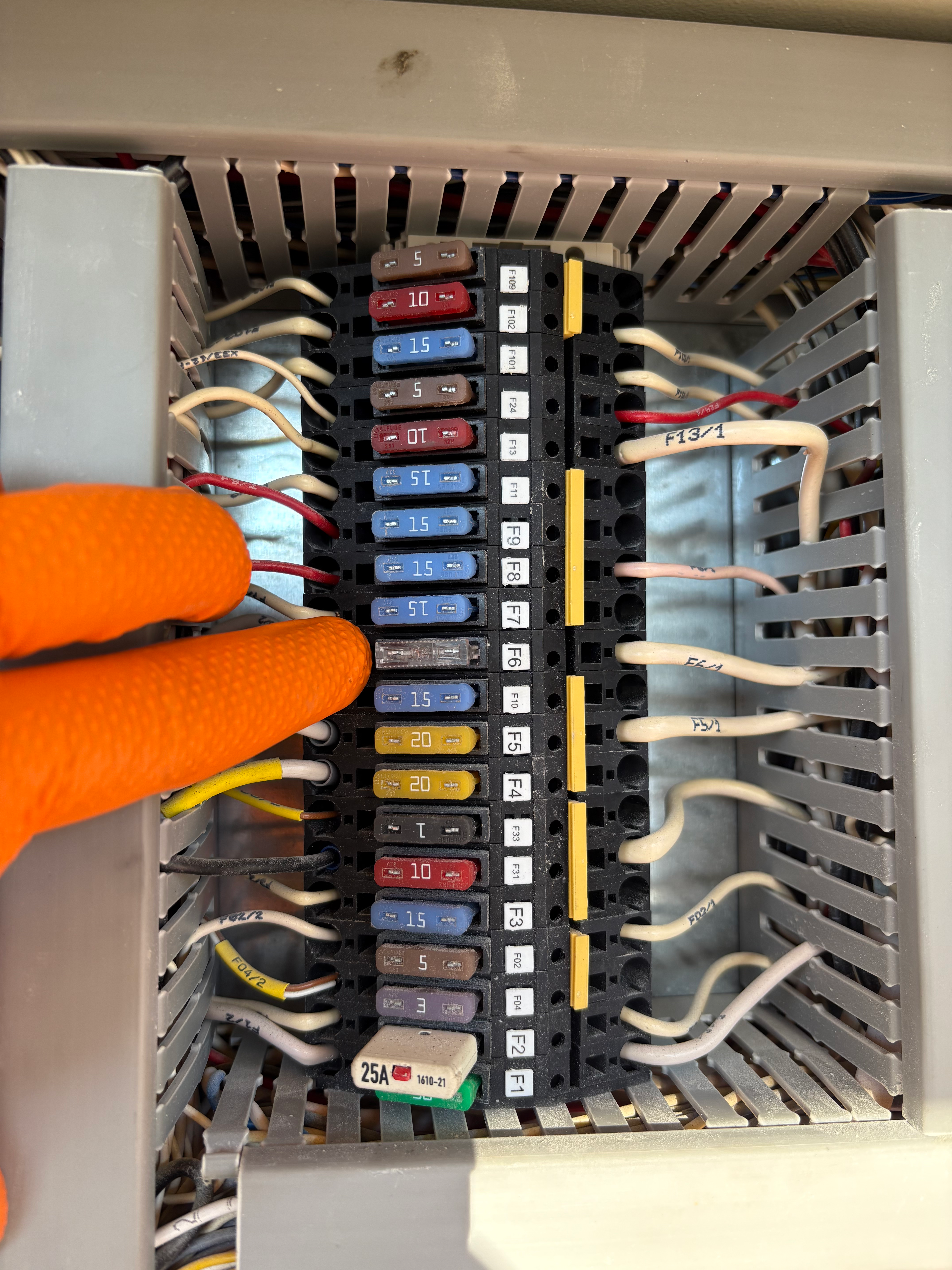 Hand inspecting heavy equipment electrical panel fuses