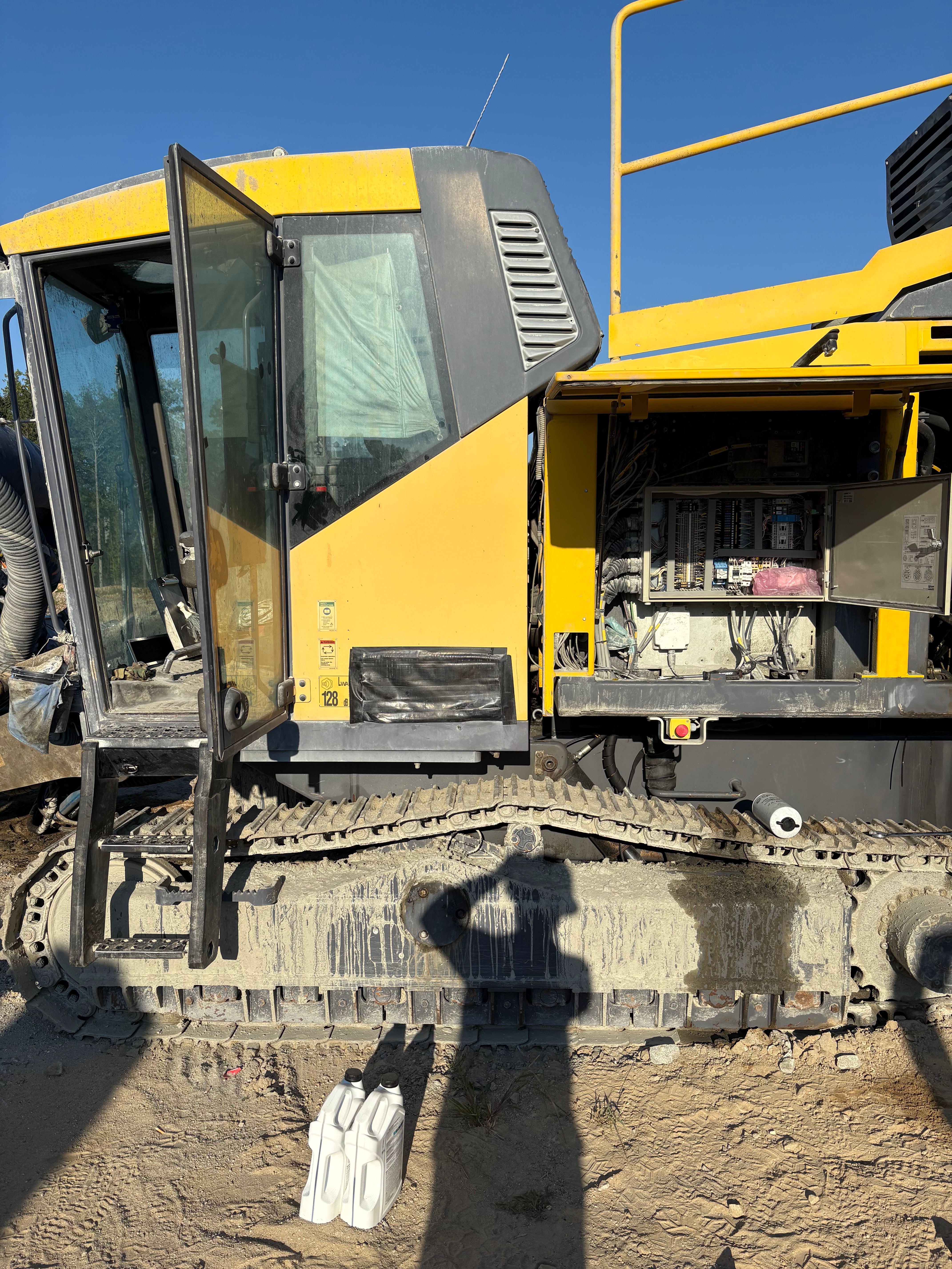Excavator with open door, heavy equipment repair