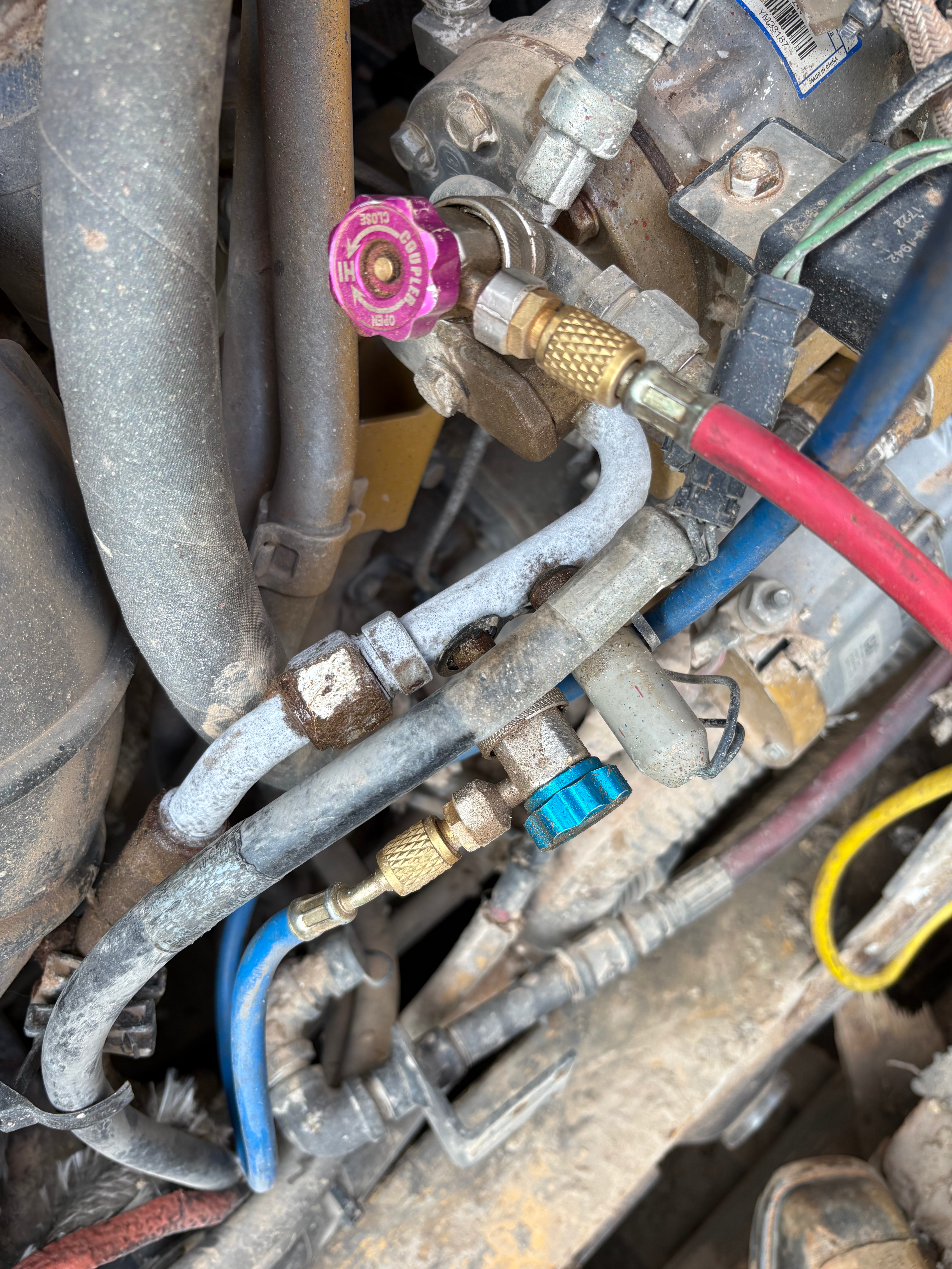 Hoses and valves on heavy equipment being repaired